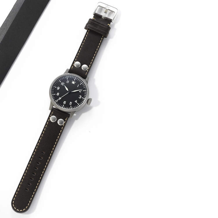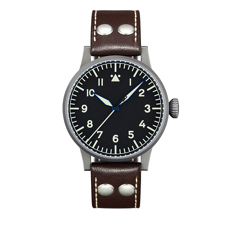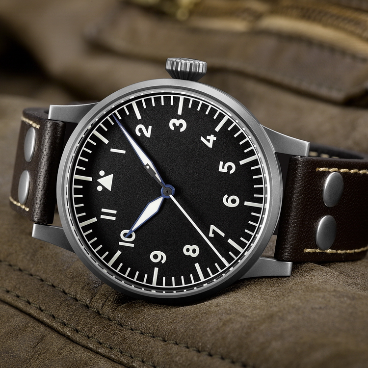 "Baumuster A"는 파일럿 위한 높은 가독성의 절제된 다이얼이 특징입니다. 숫자로 시간 표시하고, 12시에 두 점이 있는 삼각형 배치해 시야가 좋지 않을 때도 쉽게 시간 확인할 수 있습니다.