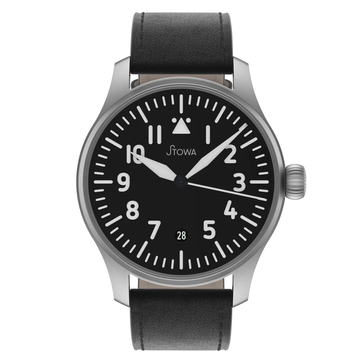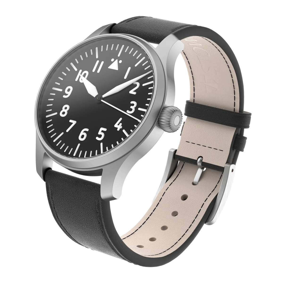 플리거 베루스 40은 WWII 당시 독일 공군이 사용하던 B-Uhr Baumuster A 다이얼을 담았습니다. 산업 디자이너 스토바 대표가 직선을 활용해 개선한 케이스와 두툼한 인덱스가 단단하면서도 오밀 조밀 귀엽습니다. 저 반사 블랙 매트 다이얼에 청색으로 빛나는 수퍼루미노바 BWG9 넘버스 & 인덱스로 낮과 밤 뛰어난 가독성 제공합니다.