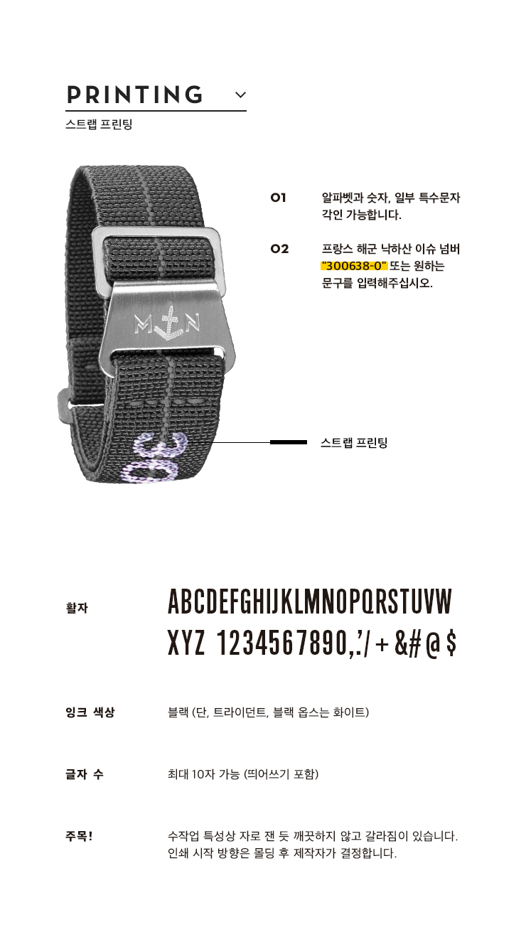 특별한 문구가 있다면 MN 나토 스트랩에 인쇄해 보세요. 세부 옵션은 아래 가이드를 참고해 주세요. 🙂