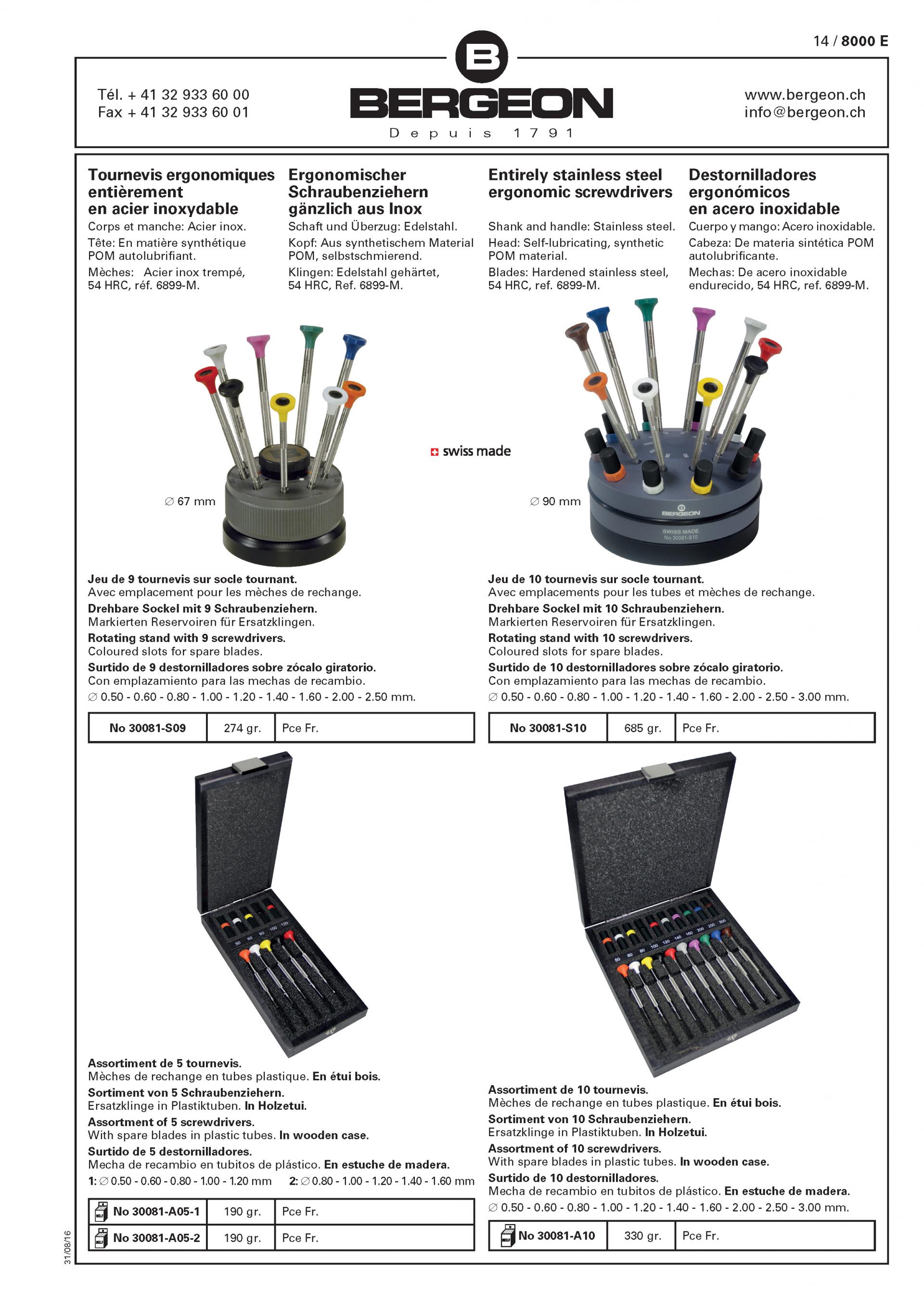BERGEON 스크루드라이버는 높은 사양을 표준으로 제작되었으며 모든 블레이드는 정확한 사양에 맞게 템퍼링 되고 정밀하게 연마됩니다. 각 사이즈 식별 컬러가 있는 회전 육각 헤드, 널링 처리된 그립 샤프트 및 교체할 수 있는 블레이드가 특징입니다. 스크루드라이버 끝에 있는 블레이드 고정 나사를 사용하여 블레이드를 쉽고 빠르게 교체할 수 있습니다. 9가지 사이즈 구성이며, 회전하는 스탠드는 스크루드라이버와 스페어 블레이드를 편하게 고정할 수 있습니다. 각 크기의 스페어 블레이드 1개씩 포함입니다.