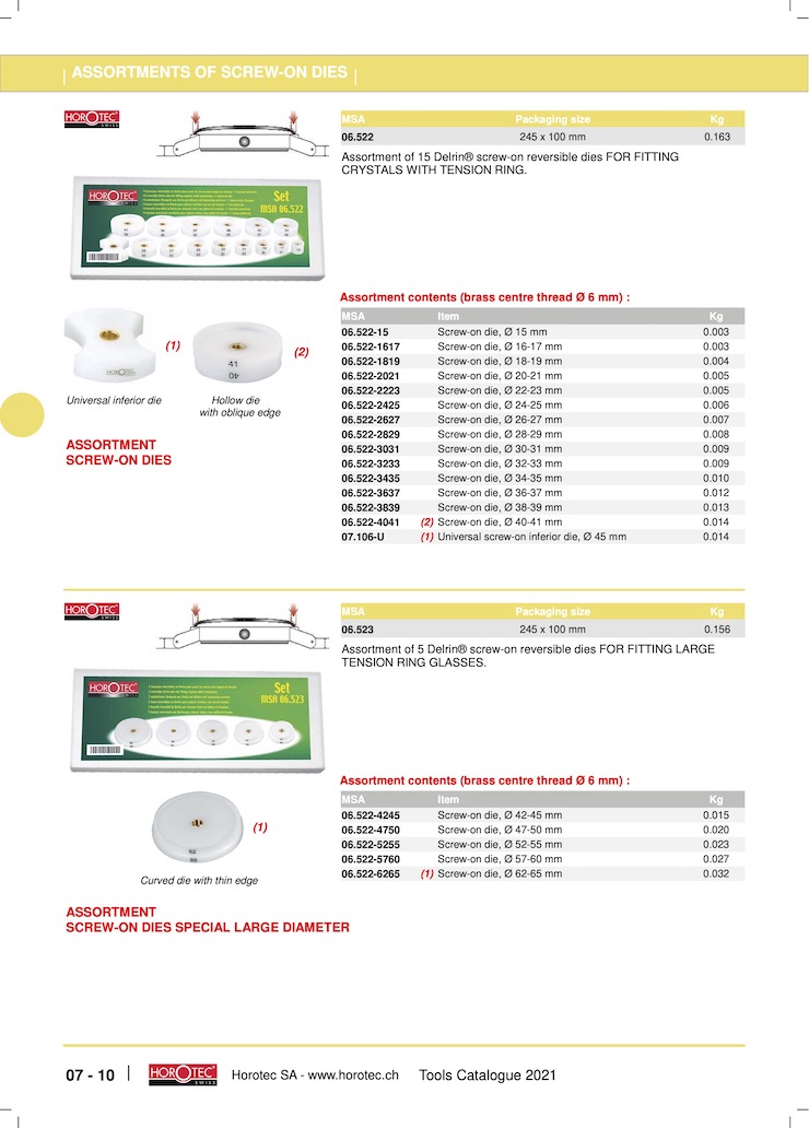 텐션 링이 있는 크리스털 글라스에 적합한 Delrin ® 소재로 제작된 다이 세트입니다. 14개의 리버시블 다이와 1개의 유니버설 다이로 구성되어 있습니다. 시계와 글라스에 손상을 주지 않으며, 중앙에는 프레스에 결합하기 위한 6mm 직경의 브라스 소재 스크루 홀이 있습니다. Horotec 케이스 프레스 또는 Bergeon 5500 프레스에 호환됩니다.