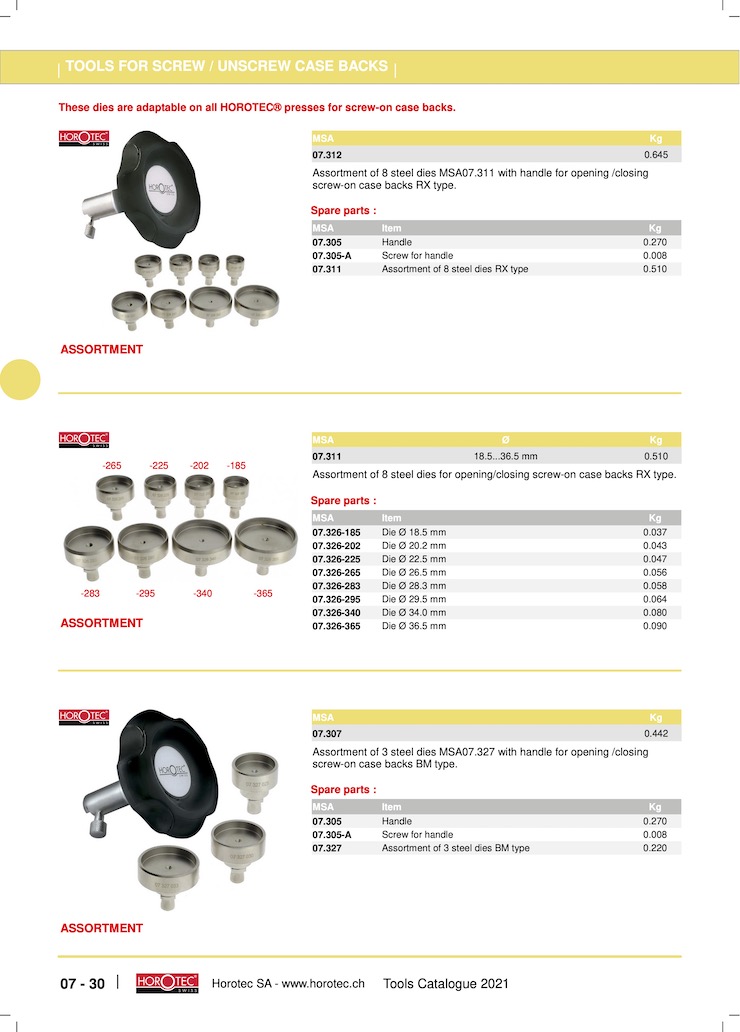 Rolex ® 케이스 백을 열고 닫을 수 있는 전용 다이 세트입니다. Sea-Dweller 모델을 포함한 오이스터 케이스 백에 사용할 수 있습니다. Bergeon과 Horotec 프레스 및 유니버설 다이 키 핸들과 함께 사용할 수 있습니다.