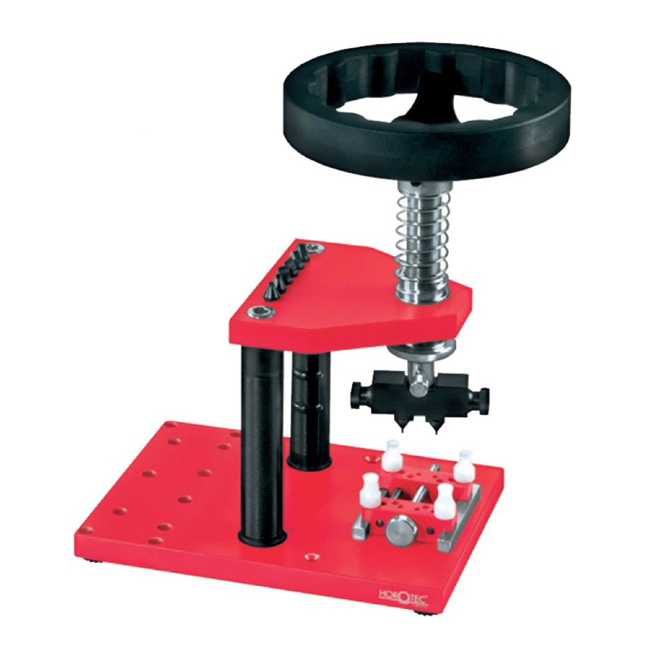 스크루 방식의 케이스 백을 위한 더욱 안정적이고 적은 힘으로 사용할 수 있는 프레스 타입 오프너입니다. 오버사이즈 핸들로 큰 토크를 낼 수 있으며, 홀더가 있어 시계를 안정적으로 고정합니다. 다양한 케이스 백을 위한 4종류의 핀은 최대 65mm 케이스 백까지 열고 닫을 수 있으며, 상하 길이 조절을 위한 어댑터가 함께 제공됩니다. 탈착식 홀더는 4개의 Delrin ® 소재의 핀이 있어 시계에 손상을 주지 않습니다. 베이스와 상단 플레이트에 블레이드와 다이를 보관할 수 있는 홀이 있습니다. 다이가 포함되지 않은 기본 패키지입니다.