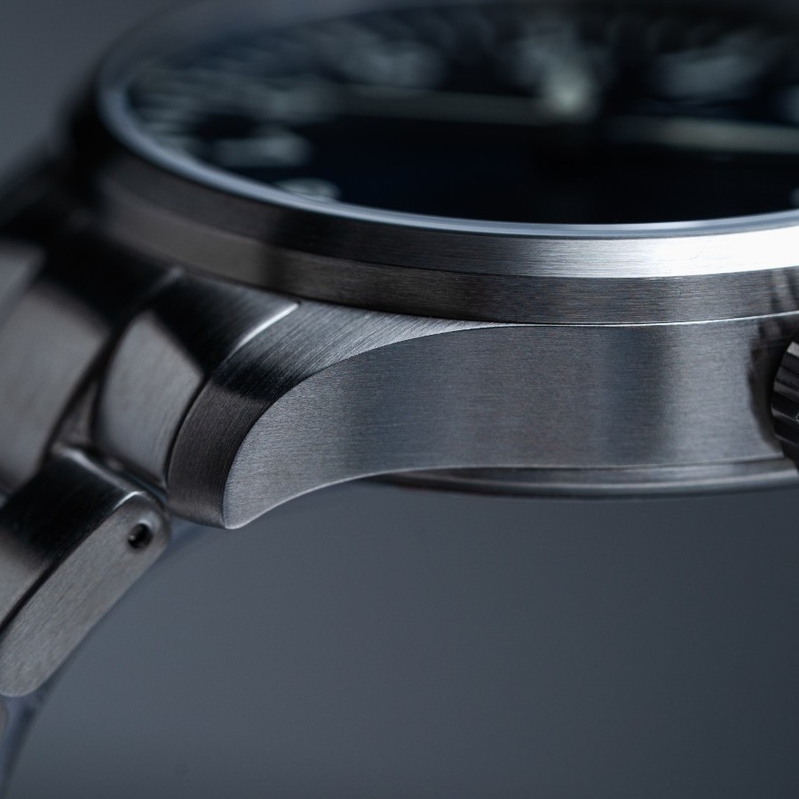 "Baumuster A"는 파일럿 위한 높은 가독성의 절제된 다이얼이 특징입니다. 숫자로 시간 표시하고, 12시에 두 점이 있는 삼각형 배치해 시야가 좋지 않을 때도 쉽게 시간 확인할 수 있습니다. 선레이 패턴의 블루 다이얼은 캐주얼 스포티 룩과 어울립니다.