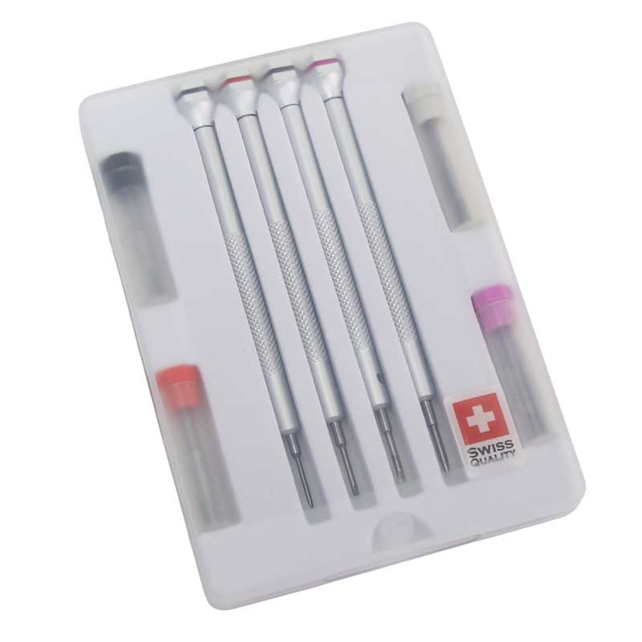 경량 알루미늄 핸들 스크류드라이버 세트는 1.00, 1.20, 1.40, 1.60mm 크기의 스크류드라이버 4개로 구성되어 있으며, 각 크기별로 여분의 블레이드 3개가 포함되어 있습니다. 더 안전한 그립을 위한 노브 처리된 핸들과 스테인리스 스틸 블레이드를 고정하는 세트 스크류가 있습니다. 스크류드라이버는 쉽게 식별할 수 있도록 색상 코드가 적용되어 있으며, 멋진 플라스틱 보관 상자에 담겨 있습니다.