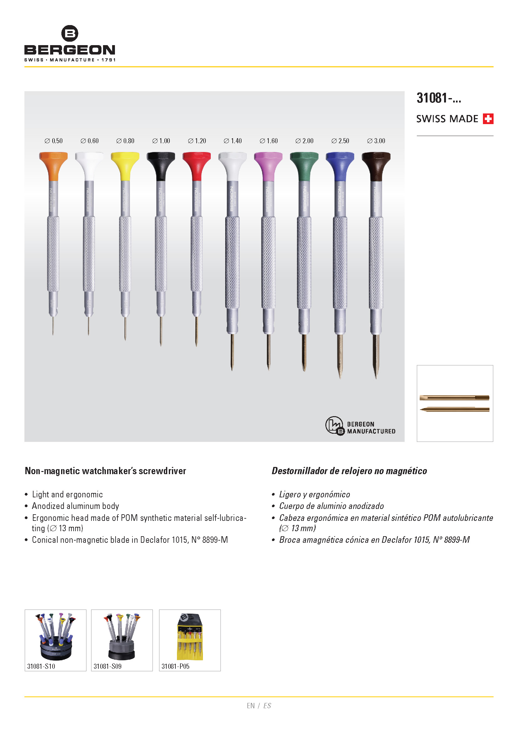 BERGEON 31081 SERIES NON MAGNETIC ALUMINUM SCREWDRIVERS SOLD INDIVIDUALLY