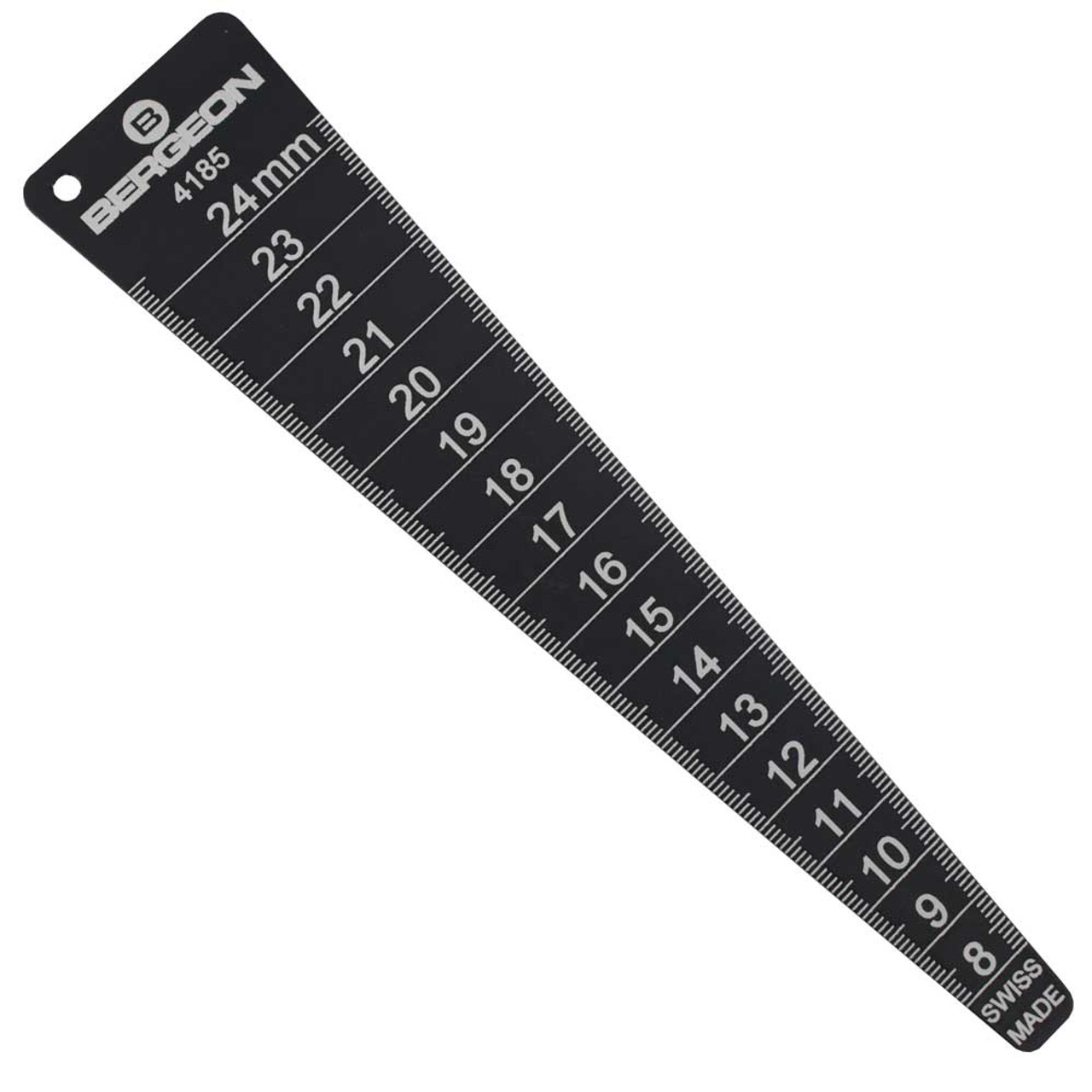시계 러그 너비를 측정할 때 사용하는 게이지입니다. 테이퍼드 형태로 쉽고 정확하게 측정할 수 있습니다. 금속으로 제작되어 내구성이 높고, 8mm~24mm까지 측정할 수 있습니다. 밀리미터 및 인치 단위로 표시됩니다.