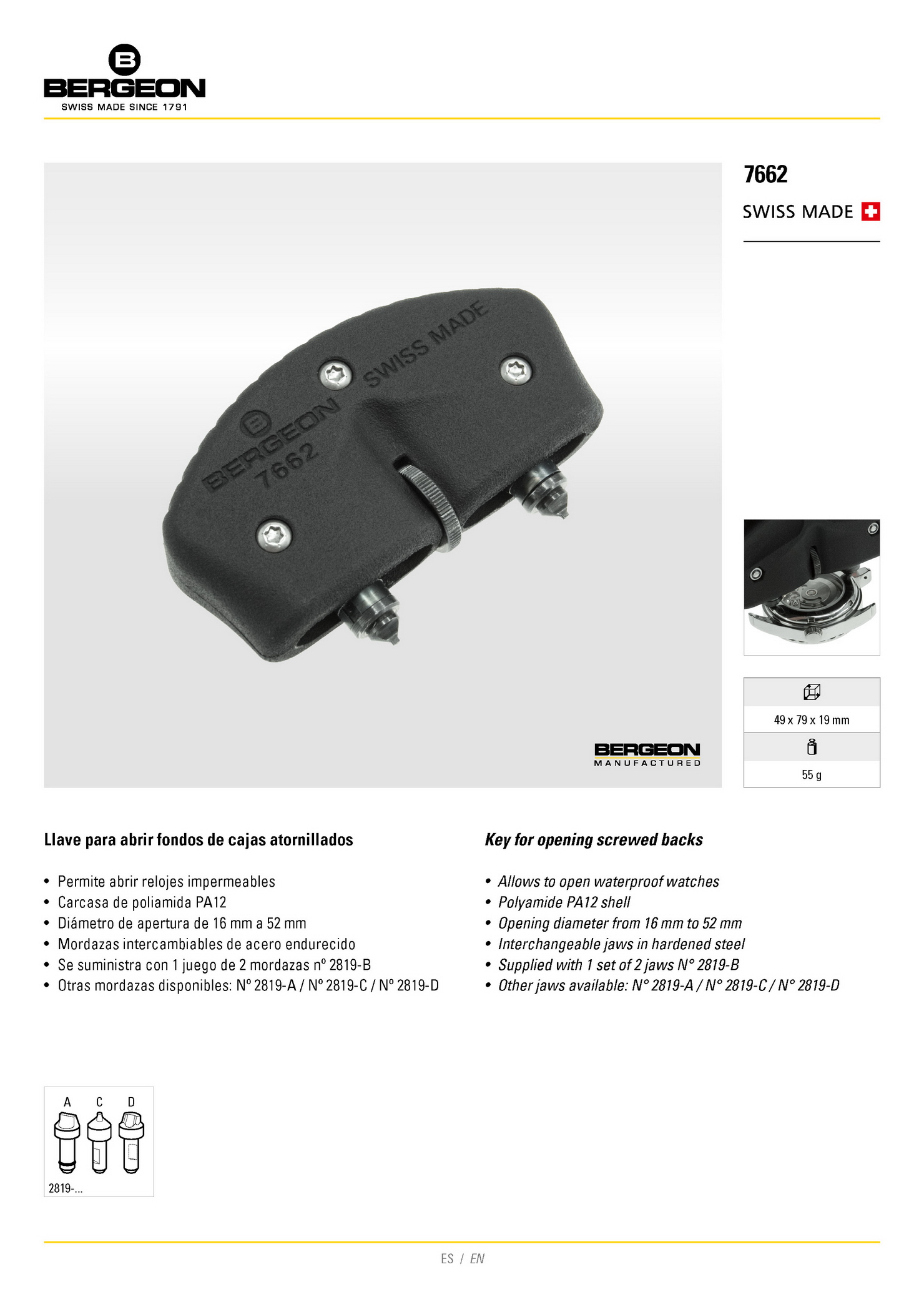 이 컴팩트 포켓 케이스 렌치는 배터리 수리 키트나 시계공 작업대에 추가하기에 좋으며, 나사식 손목시계 뒷면을 여는 데 도움을 줍니다. 경화된 강철 조절 핀과 사용하기 쉬운 조정 휠이 있어 이 도구는 홈이 있는 시계 케이스 뒷면을 잡아 쉽게 비틀어 제거할 수 있습니다. 이 스타일은 직사각형 핀을 가지고 있습니다. 최대 핀 개방 거리는 52mm입니다. 도구는 폴리아미드 PA12 외관으로 제작되었습니다.