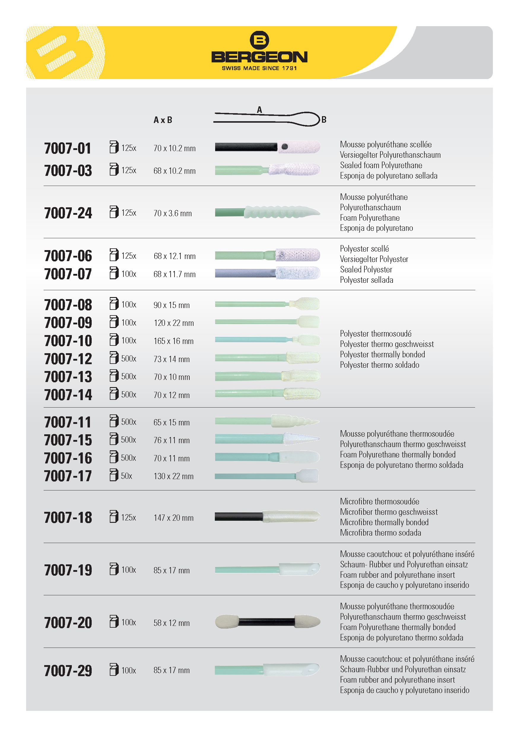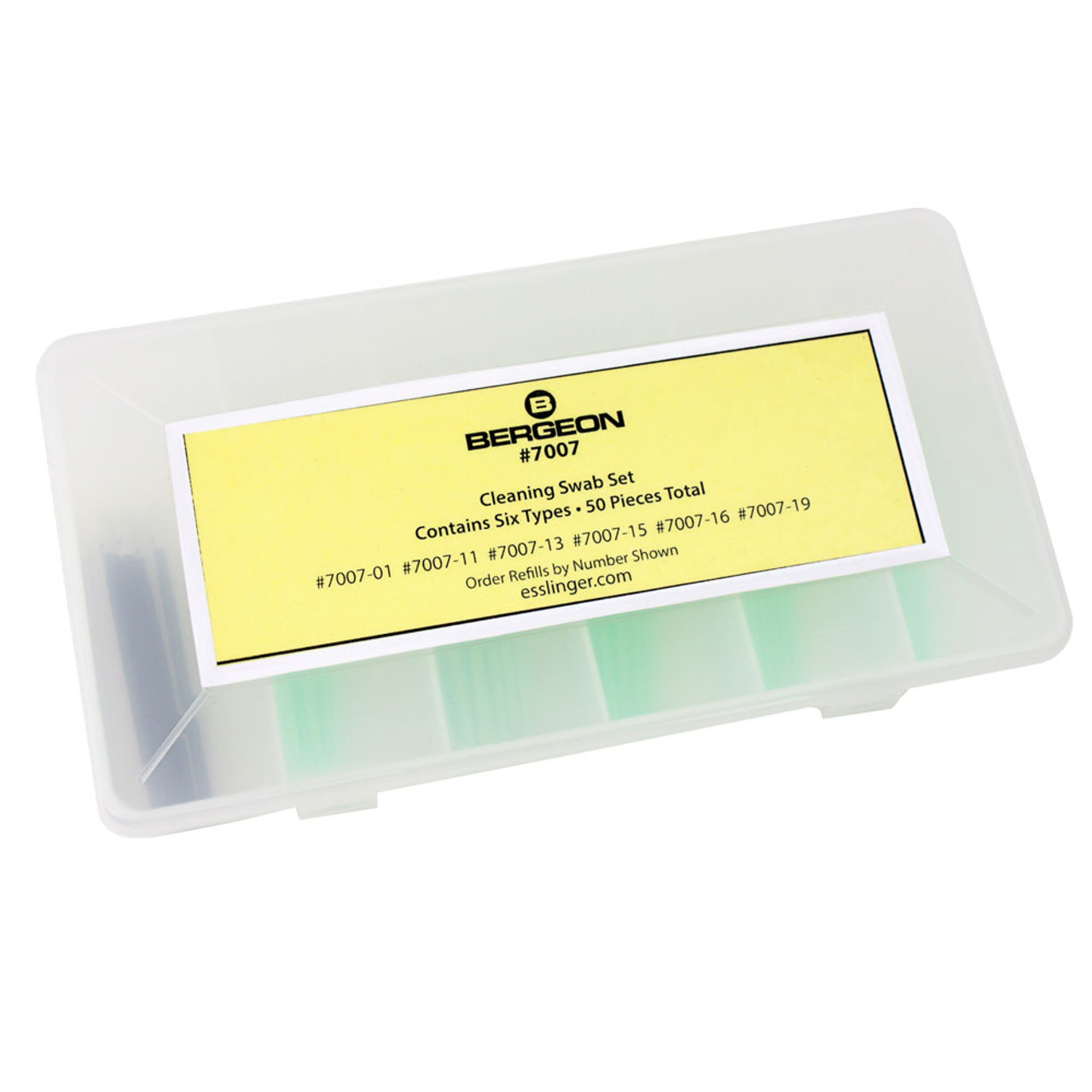BERGEON 청소 스왑 모음은 인기 있는 BERGEON 7007-S 모음의 소형 버전입니다. 이 청소 스왑 컬렉션은 6가지 서로 다른 유형의 스왑 각각에 5개에서 10개가 포함되어 있어 주얼러와 워치메이커에게 완벽합니다. 이 모음을 손에 두고 있으면 앞으로 몇 달 동안 발생할 수 있는 모든 청소 필요를 처리할 수 있습니다. 다양한 유형의 스왑 헤드가 있어 적절한 청소 스왑이나 Q-팁을 찾는 데 어려움을 겪지 않을 것입니다. 이 스왑은 가장 크고 쉽게 접근할 수 있는 영역부터 가장 작고 접근하기 어려운 곳까지 청소하는 데 적합합니다. 강한 6개 구획의 플라스틱 박스에 스냅 클로저로 제공됩니다. 키트에는 다음이 포함됩니다: