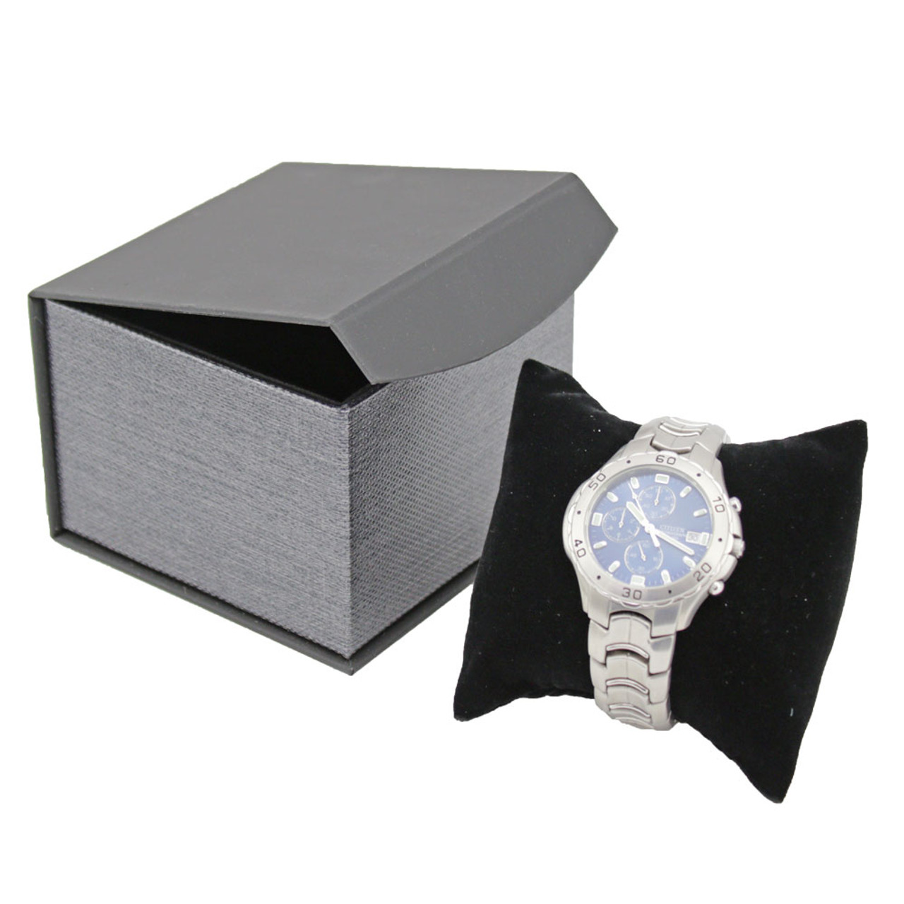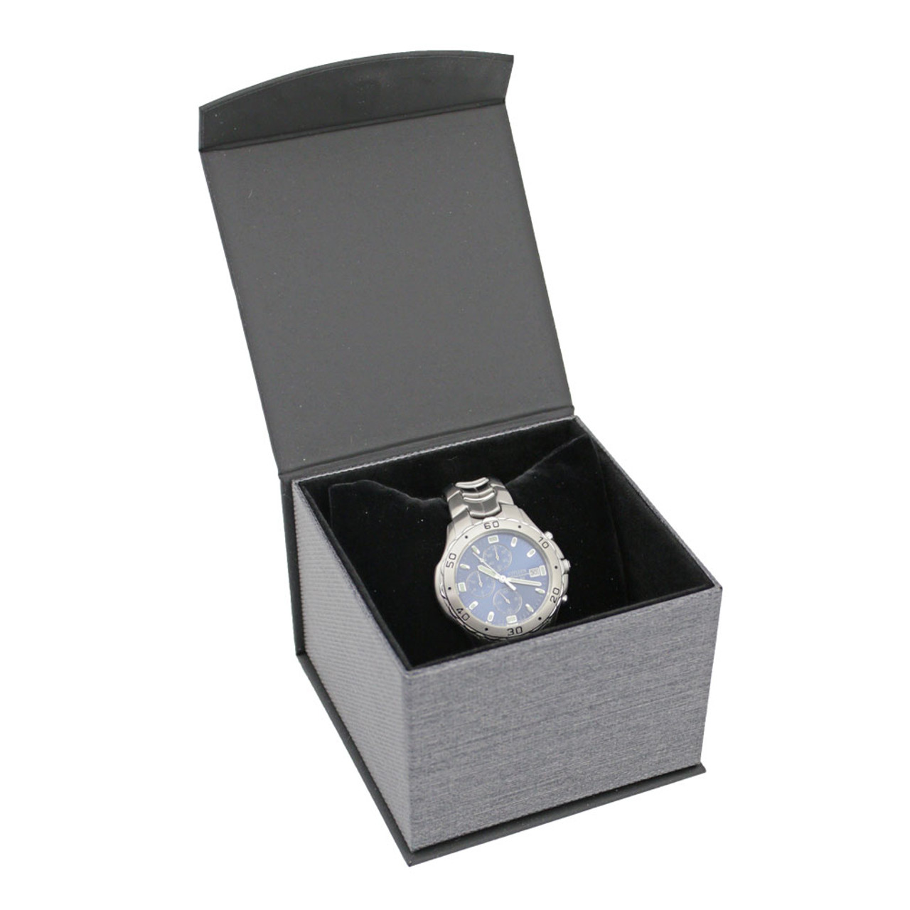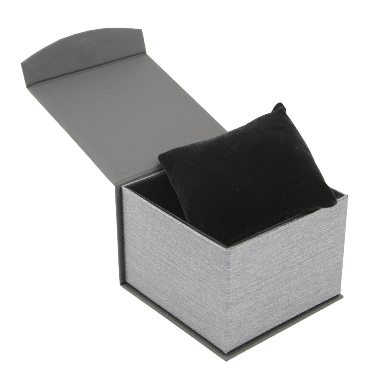 An elegant way to package wristwatches and bracelets. Ideal to use for retail packaging, watch storage, or as an impressive gift box. The watch box is well constructed with a metallic style finish, and includes a plush, black velvet pillow insert that gently cushions a watch. Magnetic closure.
