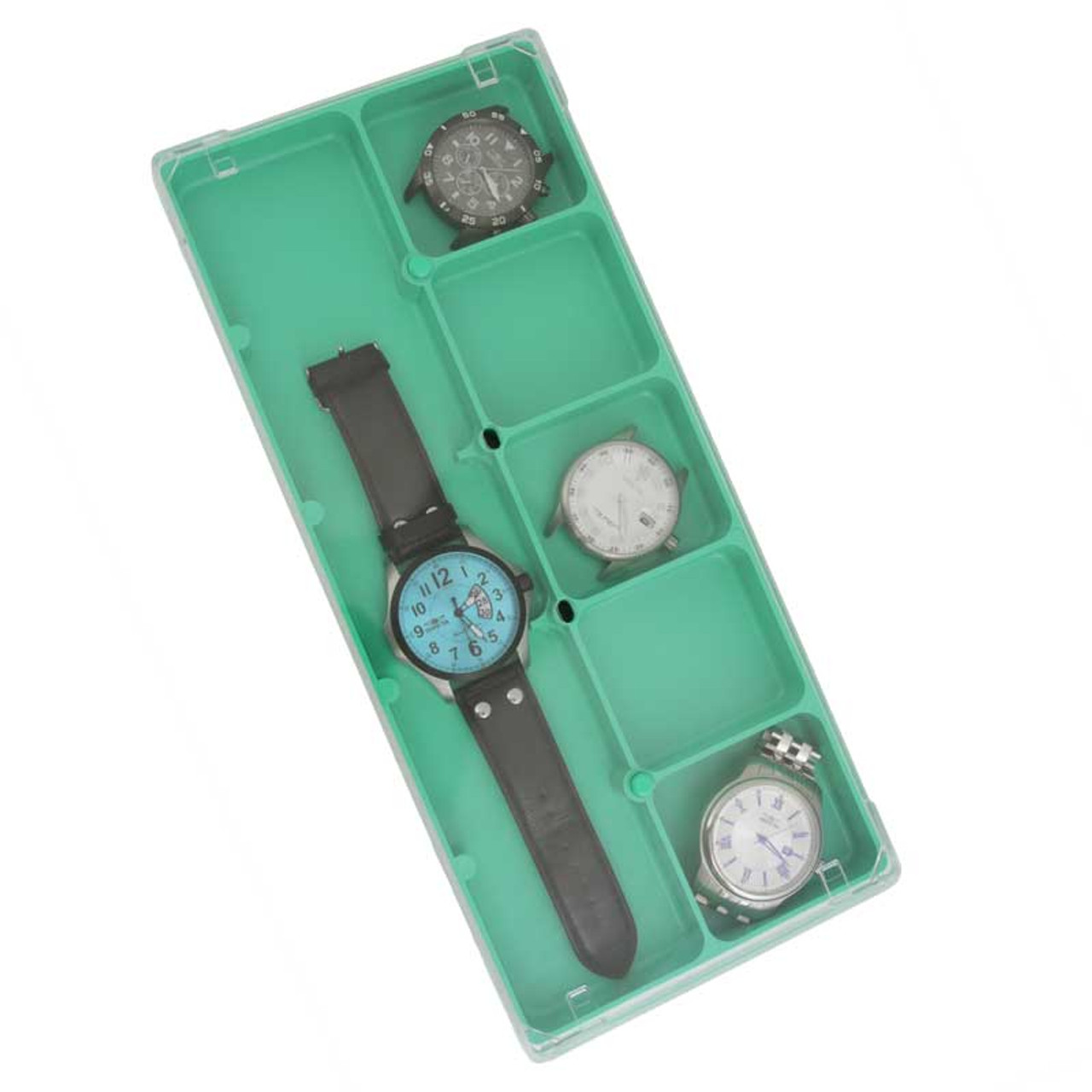 - 6 compartment: 5 small to hold small parts and 1 larger to hold the watch and band