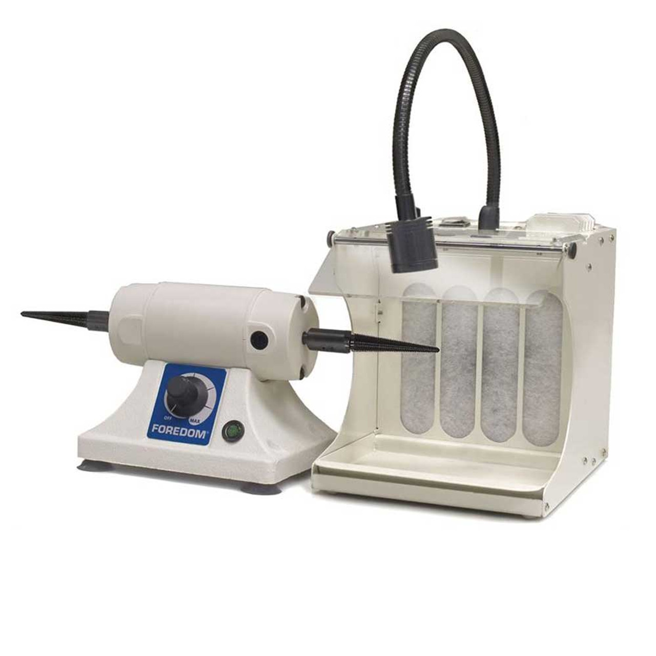 Foredom BL 벤치 선반 연마기는 MAFH25 필터 후드가 포함된 완벽한 연마 세트입니다. 이 컴팩트한 선반은 작업대에서 사용하기에 적합합니다. 1/6 hp의 고토크 영구 자석 모터를 장착하고 있어 매우 조용하고 부드럽게 작동합니다. 최대 4인치 직경의 버프와 휠을 고정할 수 있는 정밀 가공된 테이퍼 스핀들이 포함되어 있습니다. 필터 후드는 보석 제작, 치과 실험실 및 산업 작업에서 발생하는 미세한 연마 및 연마로 생성된 먼지와 큰 입자를 수집하기 위해 작업대에서 사용하도록 설계되었습니다. CE 인증을 받은 후드는 분리 가능한 금속 트레이, 투명 폴리카보네이트 쉴드, 밝고 오래 지속되는 구스넥 LED 조명을 갖추고 있습니다. 교체가 용이한 세 개의 필터가 장착되어 있습니다. 유연한 샤프트 핸드피스, 마이크로모터 및 기타 작업대 도구와 함께 사용하기 위해 작업대 어디에나 이동할 수 있습니다.