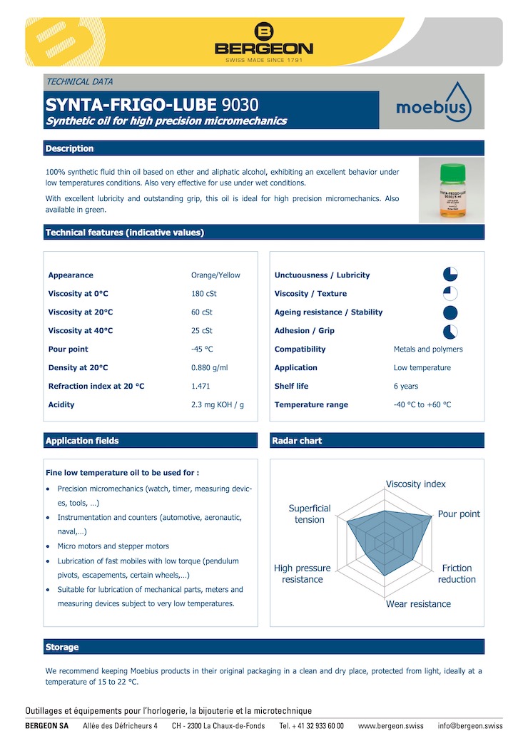 MOEBIUS 9030은 저온에 노출되는 기계식 무브먼트에 사용하기 적합한 저점도 합성 윤활유입니다.
